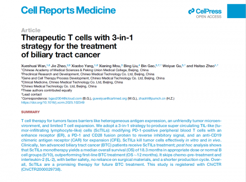 近日,中国原创的外周血类TIL细胞——ScTIL技术治疗晚期胆道肿瘤的临床研究登上《CELL》子刊《Cell Reports Medicine》。尽管这只是一个概念验证的临床研究,但在实体瘤免疫治疗领域,却是概念上的重大突破——人类首次在外周血中分离类TIL细胞并给与基因修饰,而且在恶性程度最高的癌种——胆道肿瘤上验证其临床疗效。研究数据显示,与对照组相比,ScTIL将经治无效的晚期胆道肿瘤患者的总生存期(OS)延长5倍,其OS甚至显著优于一线标准治疗。本研究的PI是北京协和医院肝胆外科的赵海涛教授,ScTIL细胞制备和技术支持由北京卡替(CHINEO)医疗技术有限公司提供。