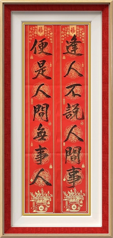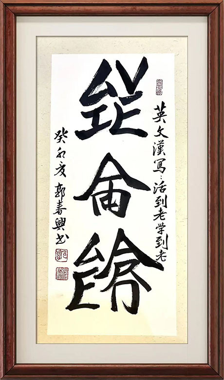 郭春兴多次随团到欧洲访问,并在德国举办过书法作品展,当地各界人士通过欣赏郭春兴的中文德文和中英文书法作品,不但看懂了书法内容,还感悟到了中华民族璀璨的文化思想内涵,他们为此而欣慰。有些外国朋友和华人收藏家想要买下郭春兴的作品,郭春兴婉言谢绝,他说:“我们是来开展文化交流的,您要是喜欢中国文化,我可以把作品赠送给您,但不能卖。”几年来,郭春兴赠送给国际友人和相关机构的作品近百幅,仅装裱费就花了几万元。 Guo Chunxing has visited Europe with the delegations several times and held some exhibitions of calligraphic works in Germany. Local people there from all walks of life were very amazed that they were not only able to understand the content of calligraphy, but also could feel the resplendent cultural and ideological connotation of the Chinese nation by appreciating Guo Chunxing’s works of German and English Written in Chinese Calligraphy. Some foreigners and Chinese collectors wanted to purchase Guo Chunxing’s works, but he declined politely,“I could give it to you as a present if you love Chinese culture, but I won’t sell my works since we are here to promote cultural exchanges. ”In recent years, Guo Chunxing has presented nearly 100 pieces of his art to international friends and relevant organizations, with tens of thousands yuan spent on the mounting alone.