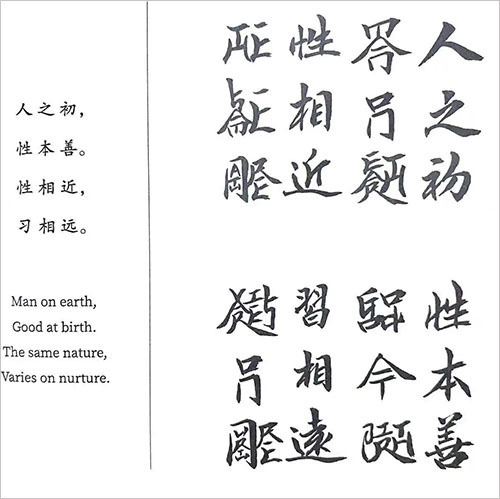 郭春兴煞费苦心将赵彦春先生的译文配上了书法,无疑为这套译作增添了光彩。不难预料,这套文集一定会受到国内外青少年的喜爱。我国青少年能够在接受优秀传统文化的同时欣赏书法和学习英语,可谓一举多得。国外一些热爱中国文化的青少年,能够通过这套文集进一步了解中国文学和欣赏中国书法艺术,也是一大幸事。选择流传广泛、通俗易懂的《三字经》《千字文》《弟子规》三种少年儿童易于理解,包含了中华文化中的文学、历史、哲学、人伦礼仪、生动故事等传统古典文本进行再创作,是一种大智慧,特别对于面向世界传播中国文化具有不可小觑的意义。 Guo Chunxing has taken great efforts to match Mr. Zhao Yanchun’s translation with calligraphy, undoubtedly adding luster to this collection. It is not hard to predict that this collection will be popular among teenagers at home and abroad. It’s so fortunate for teenagers in China to enjoy calligraphy and learn English at the same time while learning excellent traditional culture, also a great blessing for some foreign teenagers who love Chinese culture to learn more about Chinese literature and appreciate Chinese calligraphic art through this collection. It requires a great wisdom to choose these three Chinese classics for recreation, Three Word Primer, One thousand Word in English Rhyme, Canons for Disciples in English Rhyme, which are popular and easy for young children to understand, including literature, history, philosophy, human rela- tions, etiquette, and vivid stories of Chinese culture. It is of great significance especially to the spreading of Chinese culture to the world.