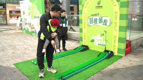 绿色相约:让循环经济触手可及 加快经济社会发展全面绿色转型,建设美丽中国,在党的二十届四中全会“牢固树立和践行绿水青山就是金山银山的理念”指引下,中国邮政集团高度重视生态环保工作,始终要求全系统胸怀“国之大者”服务国家大局,坚持走在行业生态环保领域“第一方阵”,致力于让邮政绿与生态绿交相辉映。 每年11月第一周的绿色邮政宣传周,是中国邮政与公众不变的绿色约定。当梧桐叶开始为六朝古都铺就暖黄的底色,活动现场,精心设计的体验空间让环保理念可触可感,为这座城市增添一抹生动“绿意”。 在纸箱回收区,人们纷纷带来闲置纸箱兑换精美礼品。通过设置“参与回收即可赢取礼品”的规则,活动吸引了众多本地市民加入到回收行动中,共同绘就纸箱循环利用的新图景。 在“回收邮我”高尔夫挑战区,参与者们通过捐赠纸箱获得一次挥杆机会。现场,进球时的欢呼声、鼓励的掌声,让环保行动变得趣味盎然。