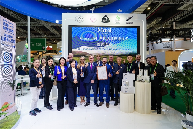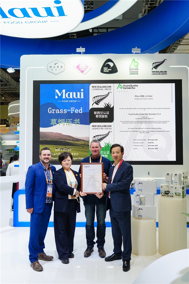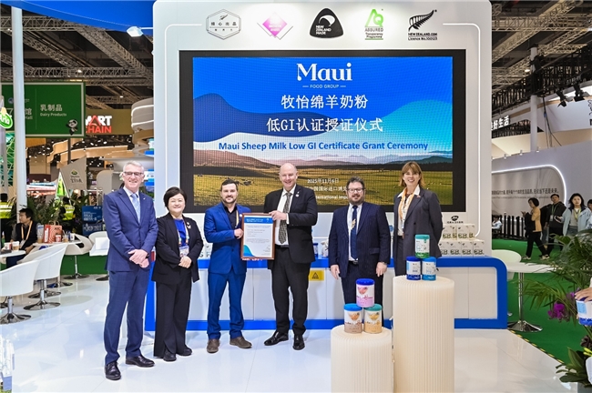 来自新西兰的绵羊奶奶源企业 牧怡食品集团(Maui Food Group Limited) 再次亮相中国国际进口博览会(CIIE),以“自然·科学·创新”为主题,全面展示其在奶源管理、健康科研及产品创新领域的全球领先实力。 牧怡总部位于新西兰,深耕绵羊奶全产业链,从自有南十字星(Southern Cross)奶绵羊羊种科技、可持续牧场管理,到高标准乳品加工与国际品牌运营,形成了行业领先的“从牧场到餐桌”的全程可追溯体系。作为新西兰绵羊奶产业的创新引领者,牧怡致力于将新西兰纯净草饲与科学营养结合,为全球消费者带来更健康、更天然的乳制品选择。 新西兰政府代表团亲临牧怡展位,共同见证牧怡于本届进博会三项具有里程碑意义的时刻: 11月8日新西兰贸易投资部长Hon Todd McClay向牧怡颁发草饲认证证书(Grass-fed Certification); 11月6日新西兰驻华大使 Dr Jonathan Austin向牧怡颁发低GI检测证书(Low-Glycemic Index Certification); 全新系列绵羊奶产品隆重发布,涵盖成人营养系列与婴幼儿营养系列奶粉。