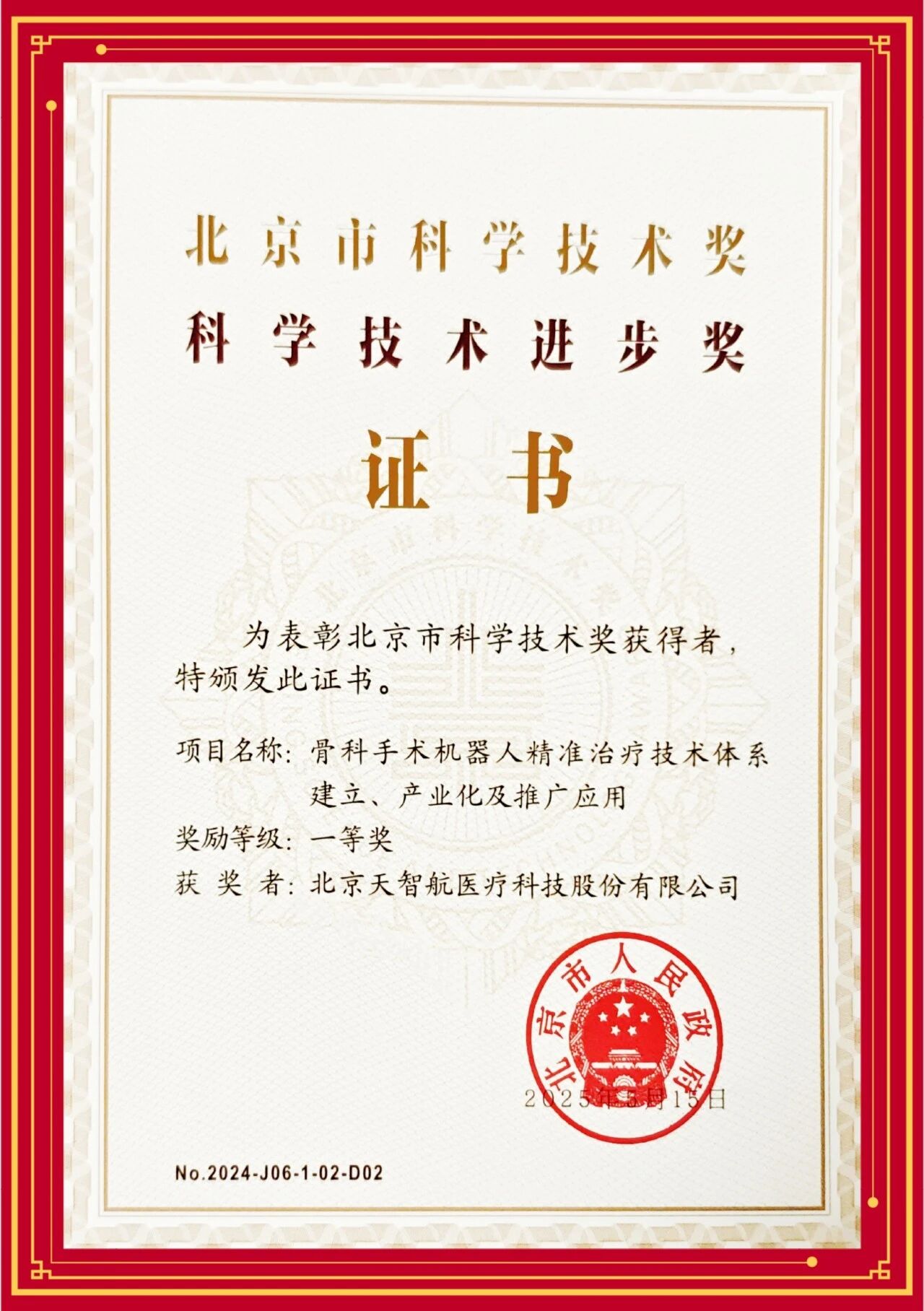 11月7日,2024年度北京市科学技术奖正式公布。北京天智航医疗科技股份有限公司与首都医科大学附属北京积水潭医院、清华大学、骨科手术机器人北京市工程研究中心等单位共同完成的“骨科手术机器人精准治疗体系建立、产业化及推广应用”项目,荣获2024年度北京市科学技术奖科技进步一等奖。