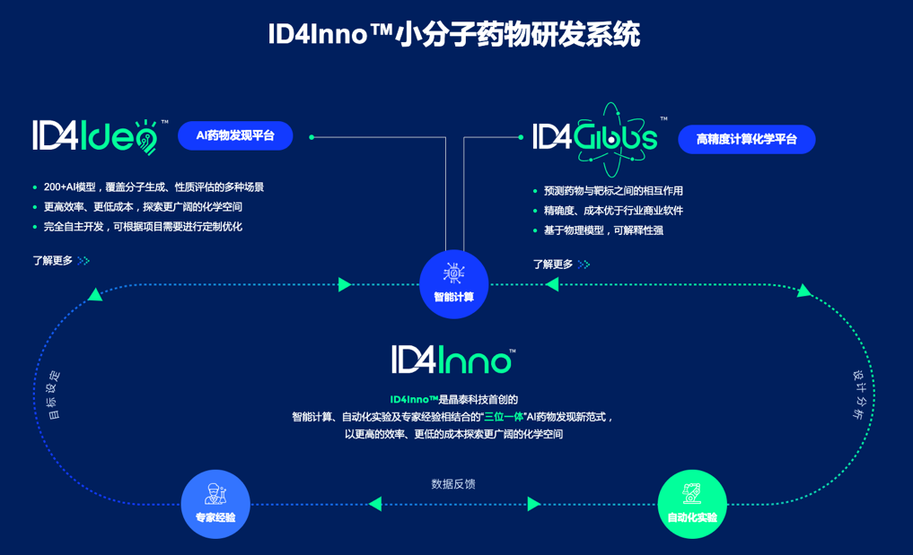 晶泰科技自主研发的 ID4Inno药物发现系统,是其小分子药物发现业务的核心。该系统创新性地融合智能计算、自动化实验以及专家经验三大模块,形成 “三位一体” 的药物研发模式。通过这一模式,能够以更高的效率、更低的成本探索更广阔的化学空间,极大地减少湿实验数量,加速药物发现 DMTA(设计 - 智造 - 测试 - 分析)循环,显著提升药物研发效率。