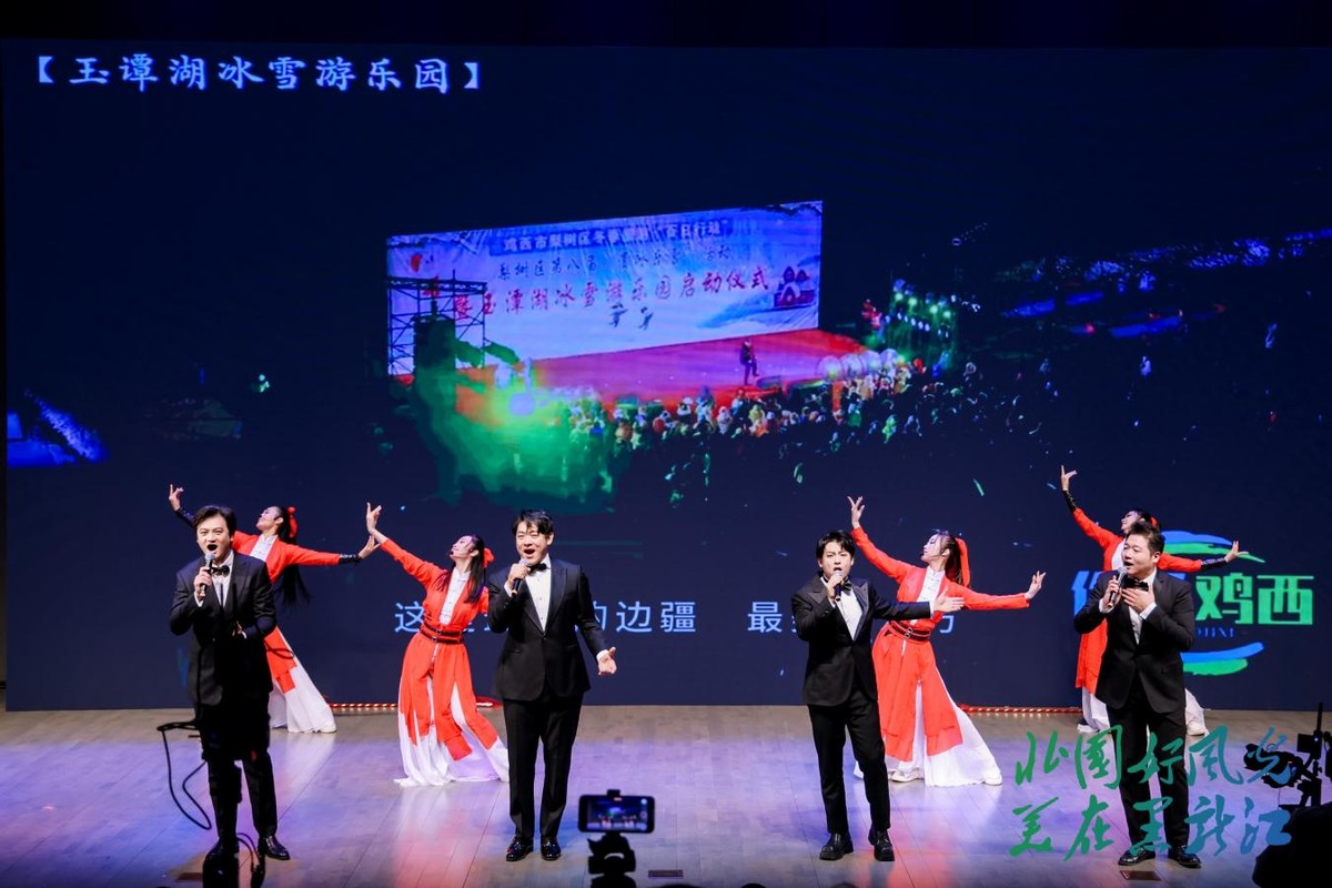 “雪趣欢歌 冠军之城”篇章精彩纷呈。牡丹江通过《智取威虎山》选段与《牡丹江在等我》的精彩演绎,将中国雪乡的童话世界、镜泊湖冰瀑的壮丽奇观呈现在观众面前;鸡西以充满创意的歌伴舞《最美江湖》展现大界江、大界湖的雄浑气魄与冰雪交融的独特韵味;七台河以“奥运冠军之城”的荣耀,向北大学子们发出体验冰上激情、感受拼搏精神的热情邀请,歌曲《少年的心藏下星辰大海》唱出了这座冠军之城的冰雪情怀;双鸭山文旅推介官重点推介了集贤县丰富的冰雪旅游资源,并以一曲《冰天雪地好个冬》展现了双鸭山的生态之美。