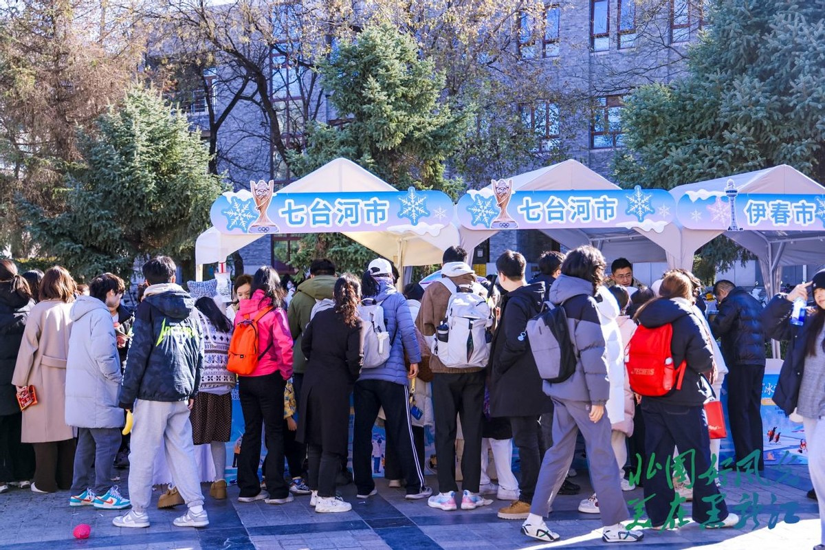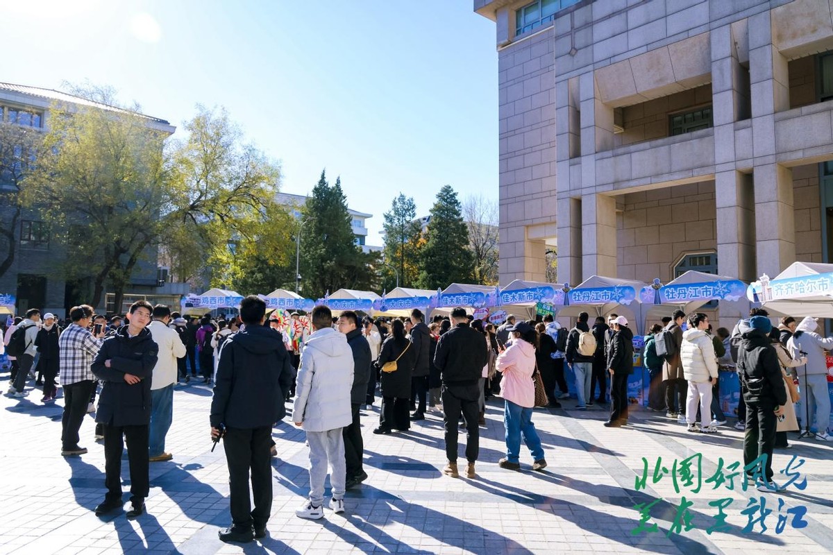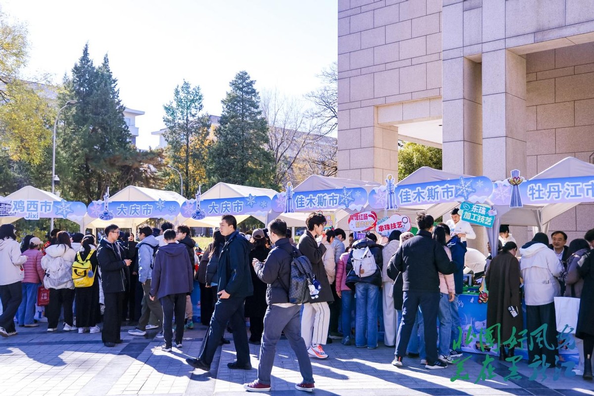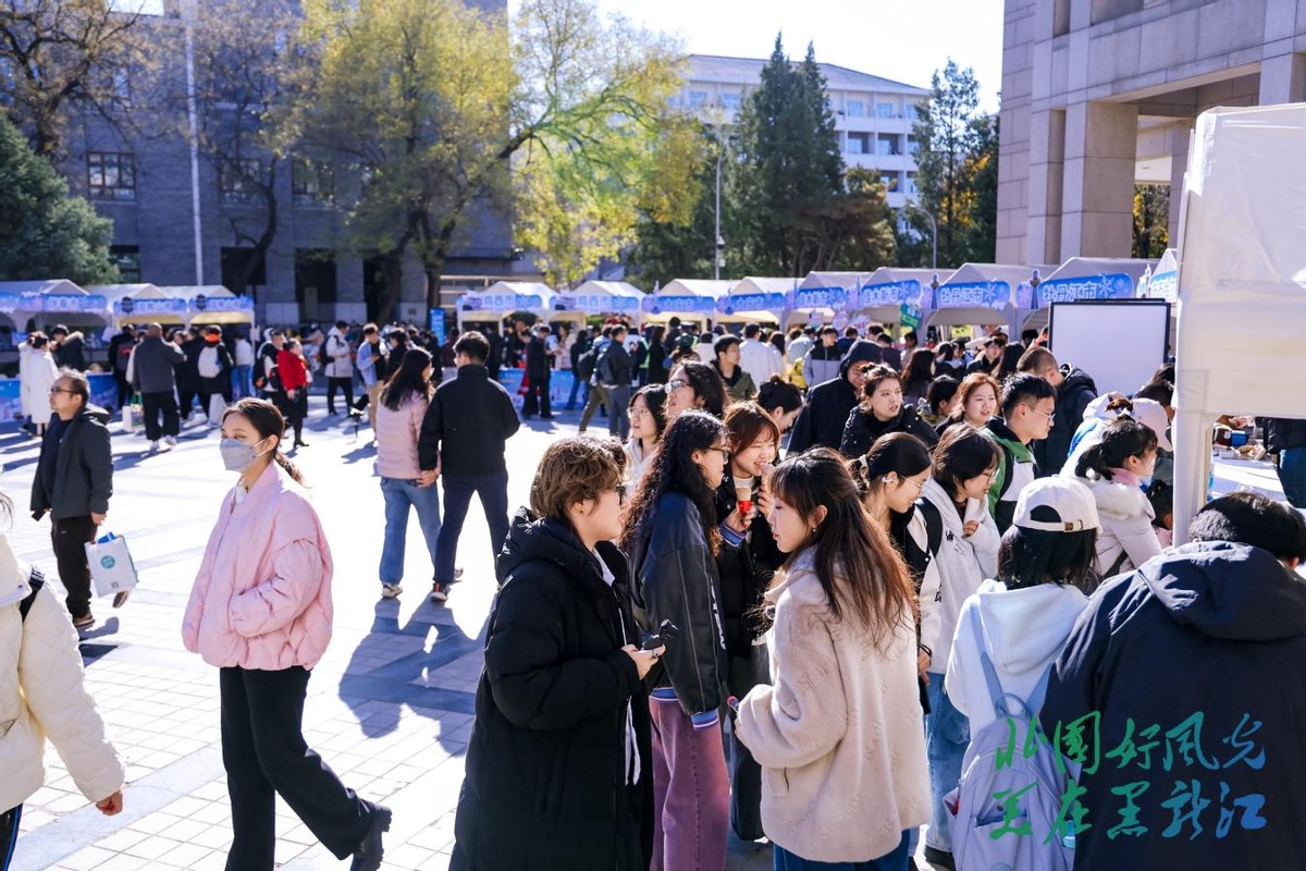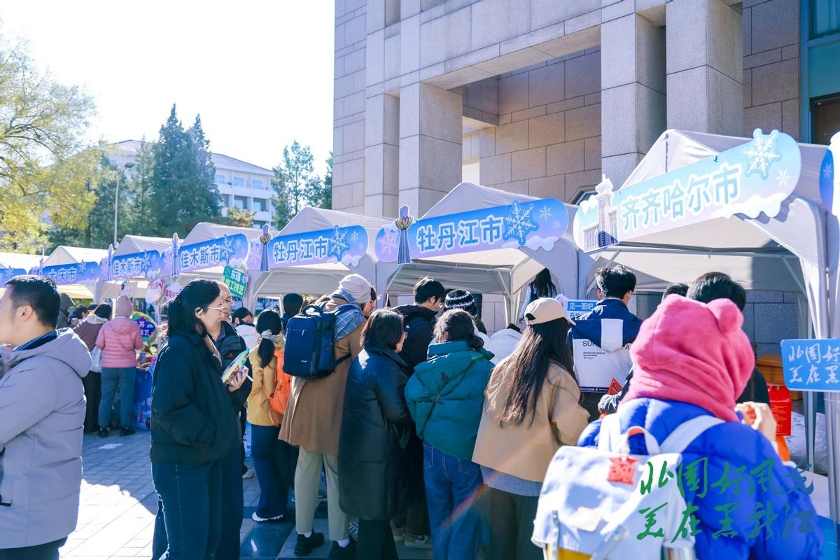 特色文旅展位前人头攒动。牡丹江林口大鹅的多种即食产品、佳木斯的蔓越莓、鹤岗的黑豆酥与特色肉肠、俄罗斯糖果、格瓦斯饮品等龙江特色美食试吃,让北大师生们感受到了地道纯正的龙江风味与热情。