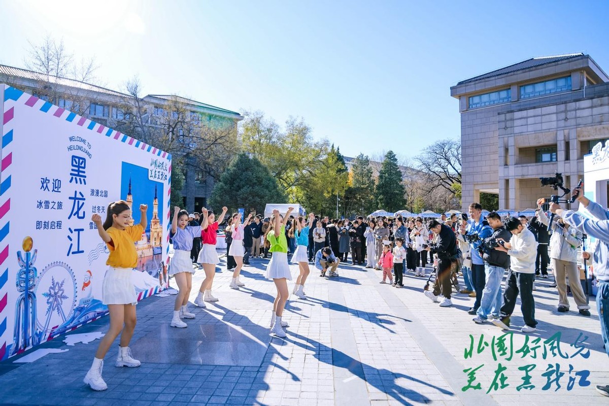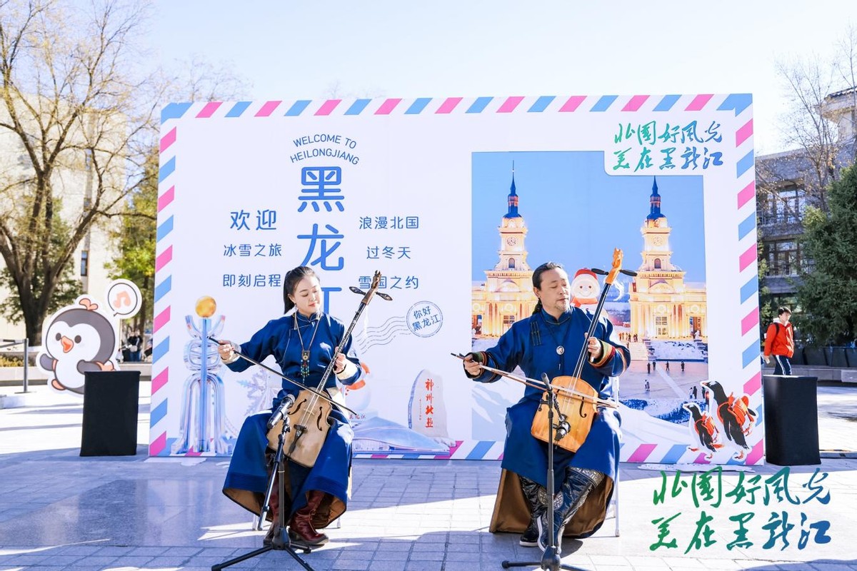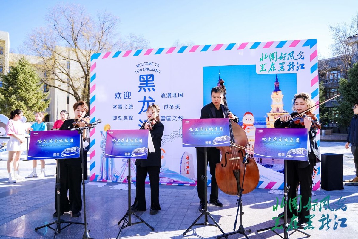 在快闪表演区,哈尔滨交响乐团的乐器合奏、大庆马头琴、佳木斯赫哲族舞蹈、大兴安岭鄂伦春族歌曲等节目轮番上演,为校园增添了浓厚的艺术氛围。十余位文旅达人和旅游博主也受邀来到现场,通过各自的镜头和视角,在社交媒体上实时直播分享这场冰雪盛宴,与线上线下观众热情互动。