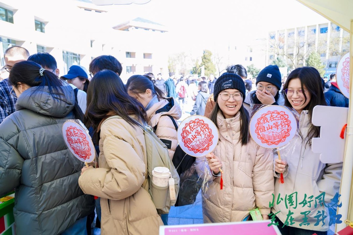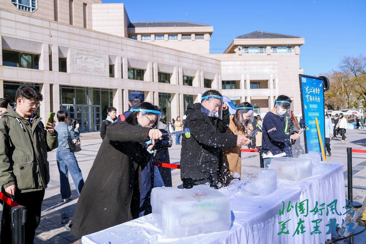 “砸冰取宝”互动游戏区始终欢声雷动。同学们手持集章卡,在完成市集打卡任务后,戴上护目镜、手持小锤,在限定时间内敲击封存着文创产品、冻梨冻柿子等礼品的冰砖,零距离感受黑龙江冬日游戏的独特乐趣。