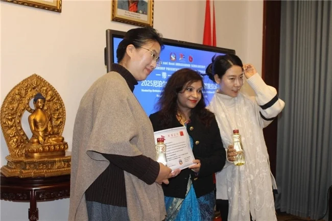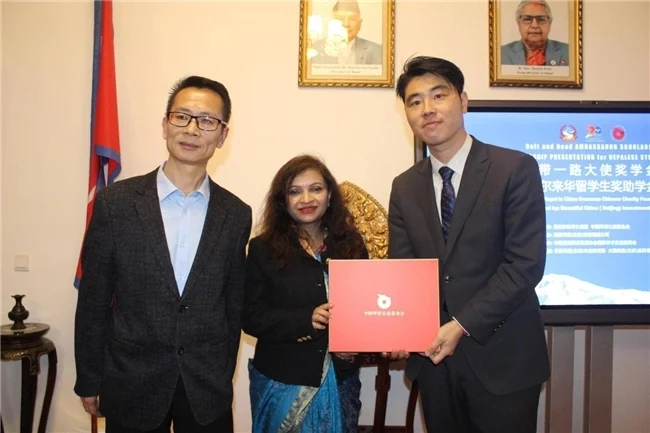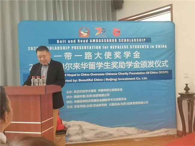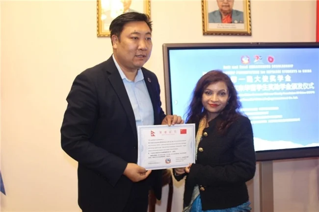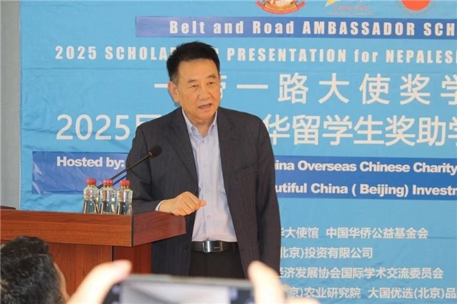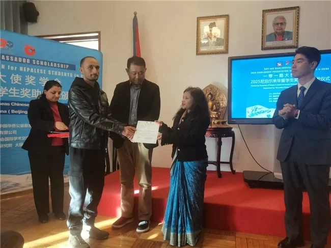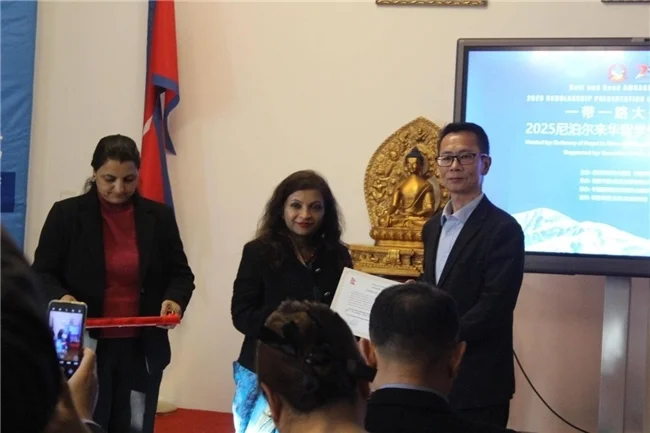 2025年11月20日下午,一带一路大使奖学金2025年度尼泊尔来华留学生颁奖仪式,在尼泊尔驻华大使馆圆满举办。尼泊尔驻华大使馆临时代办、中国华侨公益基金会办公室主任王建祥、亚洲经济发展协会常务副会长王克剑,美丽华夏(北京)投资公司代表、旱香旱稻(北京)农业研究院彭真怀院长、首席科学家彭国威教授、尼泊尔驻华使馆全体在馆官员、尼泊尔获奖留学生代表、尼泊尔国家馆运营团队代表、上合组织多功能经贸平台运营管理集团有限公司、岗玉心(上海)食品贸易有限公司、中华志愿者百福大队…等各界爱心人士共50余人参加了典礼仪式。