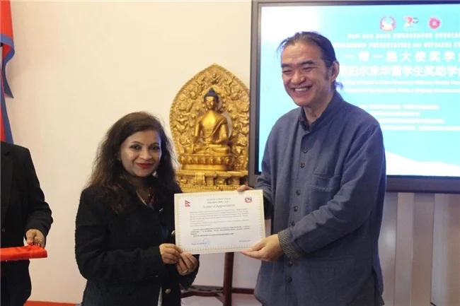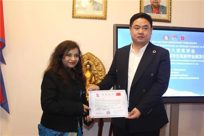 尼泊尔使馆为了感谢支持一带一路大使奖学金项目的合作单位,特意为中国华侨公益基金、中国亚洲发展协会国际学术交流委员会、美丽华夏(北京)投资有限公司颁发了感谢信及礼品,为岗玉心(上海)食品贸易有限公司、上合组织多功能经贸平台运营管理集团有限公司…等单位颁发了荣誉证书。