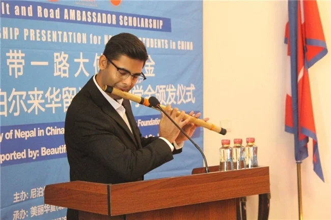 由于本次典礼是在正常上课期间,获奖学生分布在全国各地,未能参加现场颁奖典礼的学生也积极的通过录制短视频方式分享了自己的学习生活、表达对中国的感激之情。来自北大医学院的阿星Anish Tiwari在现场还为来宾献上了一曲尼泊尔传统民族乐曲的长笛独奏,赢得了现场全体嘉宾的集体喝彩。来自中国的歌唱家卡门女士的一曲美声版《我爱你,中国》更是触发了全体中尼嘉宾的情感共鸣。