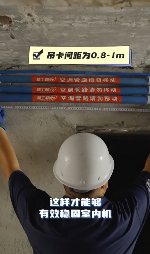 中央空调安装的专业性,藏在每一个容易被忽视的细节里。约克VRF中央空调拒绝“大概”“差不多”的模糊标准,用明确的数据和严苛的要求,从源头规避所有潜在隐患,让每一套系统都经得起时间考验。 在室内机安装环节,约克VRF中央空调有着近乎“苛刻”的规范。烟台莱山红星美凯龙约克VRF中央空调旗舰店的监理王阳,在紫御公馆一拖十项目中说到安装注意事项:室内机做好防尘保护,用薄膜或防尘罩包裹好之后,防止后续施工的灰尘进入机器,影响正常使用效果;定位安装时,室内机离吊顶需要预留大于1厘米,同时每台内机的四个角都需要采用双螺母加减震垫进行固定,不仅能有效减少噪音与共振,更能延长机器的使用寿命。而作为支撑室内机与三根管路的关键,吊卡间距被严格控制在0.8至1米之间(须大于80公分),确保结构稳固,避免长期使用后出现松动移位。针对别墅、大宅或半地下等特殊户型,约克VRF还会采用分段式排水设计,在既保障空调效果的同时,又能保证排水的通畅,杜绝后期排水的所有隐患。