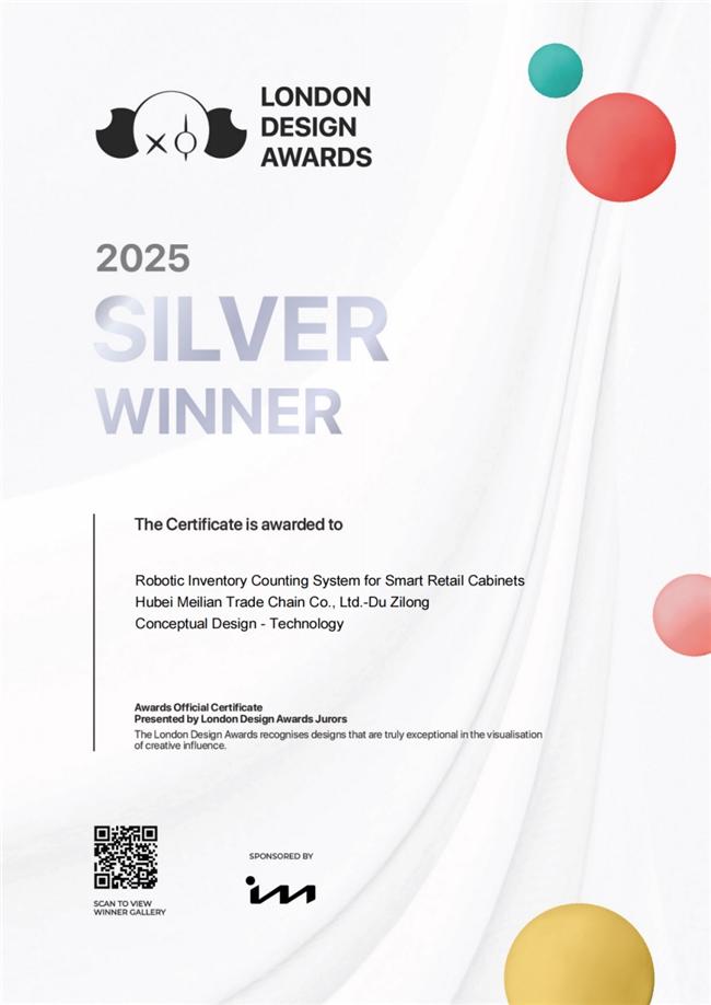 近日,全球设计界年度盛事——2025伦敦设计奖(LondonDesignAwards)获奖名单正式揭晓。中国创新力量再度闪耀国际舞台,由杜子龙先生领衔研发的“面向无人零售的智能货柜盘货机器人系统”凭借其卓越的创新设计与技术应用,从全球众多参赛作品中脱颖而出,成功摘得2025伦敦设计奖银奖,获得国际权威评审的高度认可。