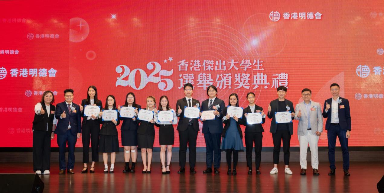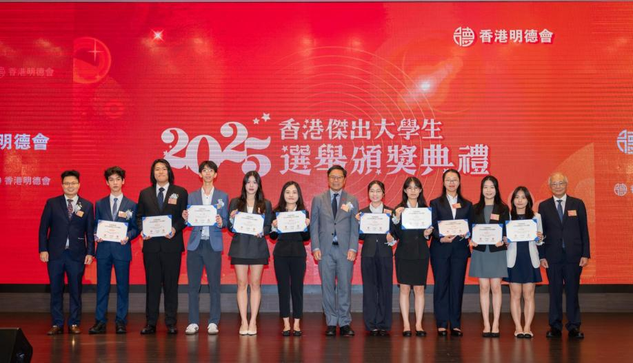 香港明德会主席李尚仁(左二)联同评审谢可仪(左一)、陈伟良(右二)及郑浩维(右一),与十位荣获「优秀大学生」奖项的同学合照。 严格评选机制 表彰卓越成就 是次选举经过严格初选,根据学术成绩、活动参与度及公益服务三项准则,于九月选出20位优秀大学生进入最终面试。当中第11至20名荣获「优秀大学生」奖项,每位获奖者获颁港币5,000元奖学金、活动参与证书及香港明德会推荐信。而最高荣誉的「十大杰出大学生」奖项,由星级评审团从20位入围者中选出十位得主,每人获颁港币10,000元奖学金、活动参与证书及推荐信。 是次「十大杰出大学生」的得奖者分别为来自香港大学的陈诗淇、余杏慈、叶汇卓、香港中文大学的方靖淇、叶炫妃、黄一隅、香港城市大学的韩鋕泓、香港岭南大学的陈灦传、香港都会大学的李慧霞、王楚雯。