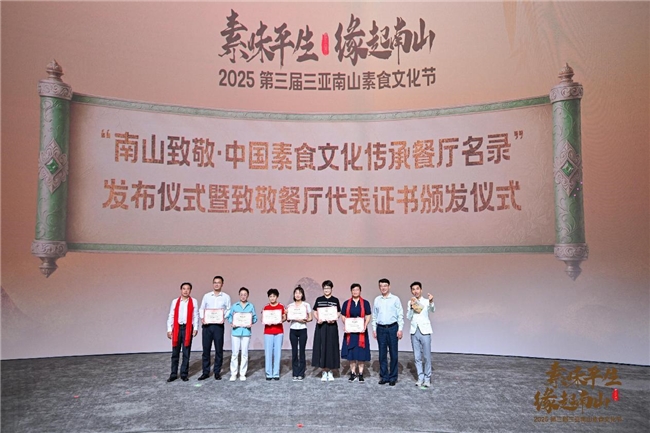 开幕式上,“南山致敬·中国素食文化传承餐厅名录”正式发布。该名录基于客观经营年限,结合数据筛查与专家评议,聚焦技艺传承与文化坚守,梳理中国素食传承脉络,向长期耕耘的行业代表致敬。现场,海南省旅游协会会长邹贤锋,海南南山文旅公司党委副书记、总经理高睿为致敬餐厅代表颁发证书,助力树立行业标杆,推动素食文化规范化传承。