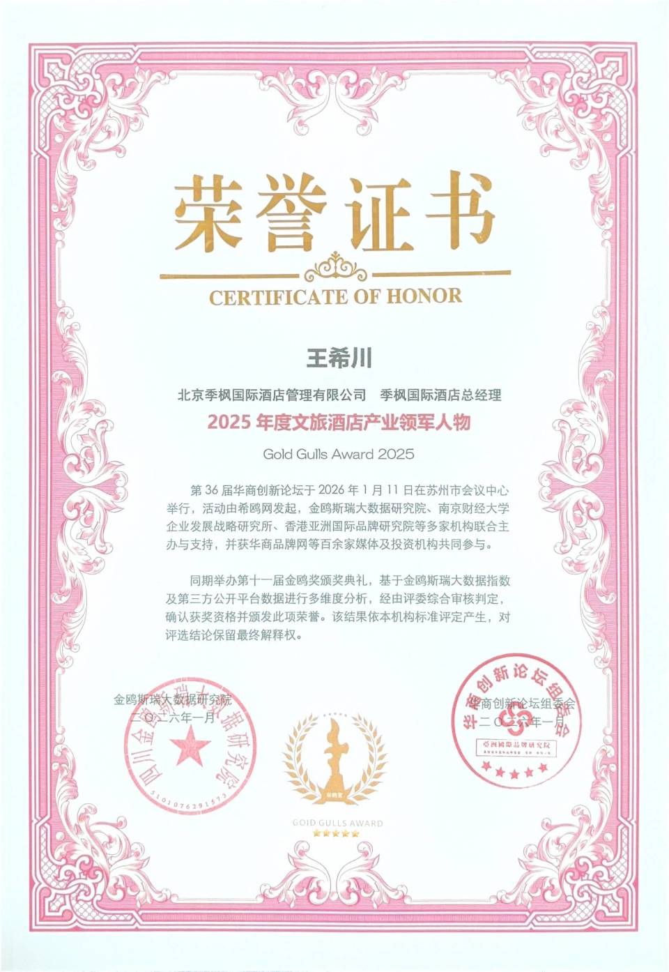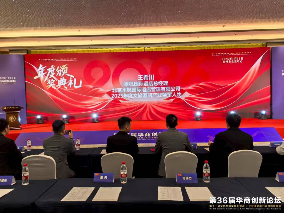 活动上揭晓了"年度金鸥奖"评选结果。其中北京季枫国际酒店管理有限公司 季枫国际酒店 总经理 王希川荣获金鸥奖2025年度文旅酒店产业领军人物。