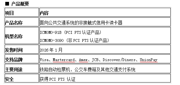 本产品是一款支持信用卡和借记卡“触控支付”的支付终端。通过将其集成到铁路车站的自动检票机或公交车的上下车系统中,只需轻挥持有的信用卡即可实现顺畅乘车,为全球公共交通基础设施的智能化做出贡献。 ■ 开发背景 近年来,以北美和欧洲为主的海外市场,无现金支付日益普及,公共交通领域也正在形成一种新标准——无需购买专用IC卡或车票,只需挥动随身携带的信用卡或借记卡即可乘车的“开环”模式。 这种全球无现金化的趋势也波及到了日本国内,特别是随着访日外国游客(入境游)的急剧增加,构建符合国际标准的支付环境成为当务之急。目前,日本特有的交通IC卡获取困难、充值手续繁琐阻碍出行等问题也日益凸显。 ■ 本产品的特点 1. 全面支持国际六大主要品牌 本产品支持以下所有国际支付品牌的触控式支付读取功能。这使得来自北美、欧洲、亚洲等地区的旅客能够直接使用常用的信用卡或借记卡乘坐公共交通工具。 支持品牌:Visa、Mastercard、American Express、JCB、Discover/Diners Club、UnionPay(银联) 2. 通过了严苛的安全标准“PCI PTS”认证 在金融交易至关重要的安全方面,我们还获得了国际信用卡安全标准“PCI PTS(PIN Transaction Security)”认证。凭借高度的坚固性和数据保护能力,为消费者安心使用支付系统提供保障。 3. 专为公共交通设计的方案 该设计基于铁路检票口和公交票价系统的集成需求,兼具读取速度快和耐用性良好的特点。