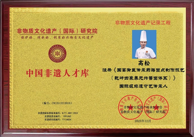 (荣誉证书) 展望未来,高松及其大师工作室的规划与愿景,正由此碗面生发开去,勾勒出一幅更为宏大的健康餐饮蓝图。首先,是深化药膳的标准化与可及性探索。《乾坤四象养元炸酱面》作为一个成功的标准化产品模型,为其未来开发更多兼具美味、养生与文化内涵的标准化药膳产品(或半成品)提供了宝贵经验。他的目标,正是践行“让千年食药同源智慧惠及千家万户”的使命,让高品质的药膳养生不再是少数人的专属,而能通过科学的转化,融入更多人的日常餐桌。 其次,是拓展培训与传播的深度与广度。高松将以这碗面及系列创新菜品为核心,开展系统的餐饮考察与培训。这不仅包括技艺的传授,更涵盖药膳理论、食品安全管理、国宴文化美学等综合知识的传播。通过培养更多理解并擅长药膳国宴理念的从业者,他将个人的技艺与智慧,转化为推动行业进步的力量。他的直播等新媒体传播方式也将持续,构建更立体的药膳文化传播矩阵。 最后,是持续推动中华饮食文化的国际对话。通过参与国际赛事、文化交流活动,以及未来可能的产品与理念输出,高松希望将这种融合了健康、美学与哲学的中国当代餐饮智慧,展示给世界。让世界看到,中华美食不仅是古老的历史遗产,更是能够回应现代健康关切、富有生命力的当代创造。 从师门苦学到博采众长,从坚守正宗到大胆重构,从潜心研发到开放传播,高松以一位匠人的执着与一位文化使者的视野,在灶台方寸之间,勾勒着中华餐饮未来发展的另一种可能。他以国宴技艺为骨,确保品质的卓越与形式的尊严;以药膳智慧为魂,坚守疗愈身心、和谐平衡的内核;以创新思维为翼,翱翔于时代需求与文化表达的广阔天空。《乾坤四象养元炸酱面》正是这一哲学的具体化身。它预示着,在未来,高松将继续在这条融合传承与创新的道路上深耕,让中华优秀饮食文化在新时代的浪潮中,不仅得以延续,更能不断焕发新的生机,绽放出更加温暖、健康、充满智慧的光芒,照亮更多人对美好生活的追求之路。一碗面,虽小,却足以容纳一个关乎健康、文化与未来的乾坤宇宙。 中国区电话微信:15909865788国际区电话微信07012785777