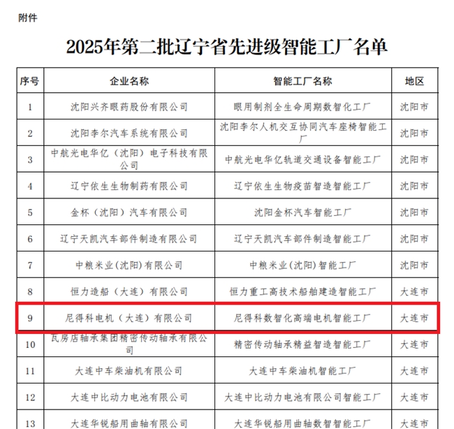 近日,尼得科集团旗下尼得科电机(大连)有限公司(以下简称“尼得科电机(大连)”)成功获评“辽宁省先进级智能工厂”。这一荣誉的取得,标志着尼得科电机(大连)在智能制造领域再上新台阶。此前公司已获评“TISAX最高等级(AL3)体系认证”、“省级绿色工厂”以及市级专项资金支持的“新型技改项目”,这些成果共同彰显了公司在高质量发展道路上的战略布局与扎实成果,标志着公司已跻身智能制造、信息安全、绿色环保和技术创新的行业先锋行列。