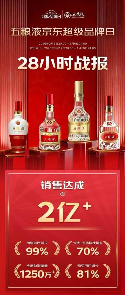 2月7日,京东超市“五粮液京东超级品牌日”成绩斐然。数据显示,五粮液京东超级品牌日期间五粮液整体销售超2亿,比去年同期增长99%,购买用户更是激增81%。 在活动期间,双支装、礼盒装产品销售同比增长70%,世界杯联名款成为备受消费者喜爱的趋势新品,反映出节日礼品消费与高端收藏需求持续升温。