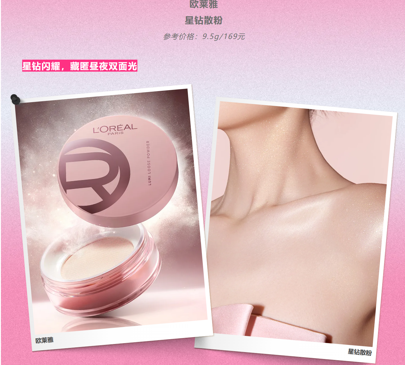 欧莱雅干皮底妆家族首款散粉,巧妙融合超细粉色碧玺微粒与云母碎闪,成就“一盒两用”的梦幻妆效。 日光下,如覆上一层粉光滤镜,柔焦提亮,元气自然;灯光下,细腻碎钻光泽顷刻迸发,肌肤宛若披上星河。
