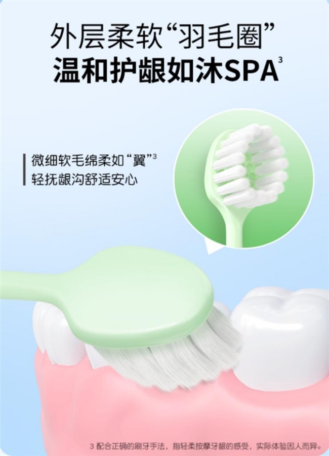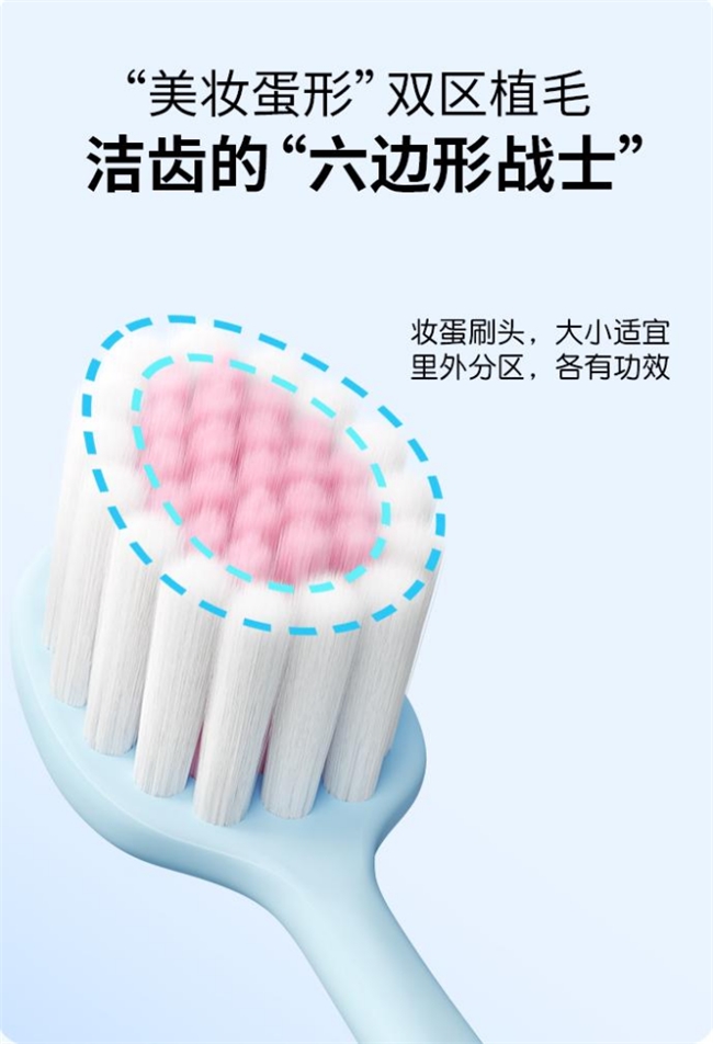 美妆蛋形双区植毛设计则进一步升级清洁体验,借鉴美妆蛋柔软贴合、精准修饰的核心逻辑,打造贴合青少年口腔结构的双区植毛刷头,兼顾深层清洁与温和护龈。该设计采用类似双重混合植毛的科学理念,分区布局、各司其职:内侧刷毛侧重深层清洁,排列紧密且稍具韧性,可深入牙缝、牙龈沟及正畸托槽缝隙,精准清除盲区污垢,避免菌斑堆积;外侧刷毛则更为柔软纤细,呈弧形包裹牙面,清洁同时轻轻按摩牙龈,促进牙龈血液循环,缓解牙龈红肿、出血问题,实现“清洁+护龈”同步进行,如同美妆蛋修饰肌肤般细腻呵护青少年娇嫩牙龈,彻底解决普通牙刷“清洁不彻底”“刺激牙龈”的双重痛点。