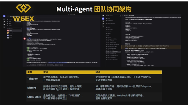 以下是 WEEX Labs 总结的四大核心理由: 频道化结构:为 AI 打造天然的“职能办公室” Multi-Agent 系统成功的核心在于分工 。Discord 最大的优势在于其灵活的频道(Channel)机制 : 信息归纳极其清晰: 我们可以将不同的功能专案设置为独立频道,例如 #行情监控、#内容产出、#代码审计等 任务隔离与专注: 每个智能体可以在特定的频道内各司其职,有效避免了单一对话流中常见的“信息过载”和“上下文混淆” 自动化协同: 在演示中,Discord 展现了相比Telegram较为不错的自动分工执行能力 胜过 Telegram 的管理精度 虽然 Telegram也是 Crypto 圈的常用工具,但在管理复杂的 Multi-Agent 架构时,它的局限性就显现出来了 : 组织架构: 相比之下,Discord 的分频道管理模式比 Telegram 的单线条对话群组更加清晰高效 。 多 Bot 协作: 在 Discord 中,我们可以更直观地观察到 Leader Bot 调度各子 Bot 的全过程,这对于调试和优化 Agent 的协作逻辑至关重要 。 安全与资产隔离的“护城河” 在 WEEX,安全性(Security-First)永远是第一优先 。在选择平台时,我们有严格的资安考量: 独立平台原则: 建议使用独立平台搭建,避免使用私人设备或账号开放权限 风险受控: Discord 允许我们创建完全隔离的服务器环境,确保智能体操作账号与公司核心资产、私人信息流之间存在物理隔离 为什么不选择 Lark(飞书)或其他办公软件? 尽管飞书等平台在人类协作中表现出色,但在目前的 AI 代理实战中,它们仍存在不少壁垒: 使用限制: Lark 等平台目前存在较多的权限控制和使用限制,不便于 AI 智能体的快速进驻与频繁调用 行政审批成本: 将智能体引入企业通讯软件往往需要经过复杂的 HR 流程和资安合规咨询 开发生态: 相比之下,Discord 对机器人(Bot)的开发生态更为友好,支持更灵活的 API 串接 对于 WEEX Labs 而言,Discord 不仅仅是一个聊天软件,它更像是一个“AI 操作系统”。它提供的频道化逻辑,在特定场景之下完美契合了多智能体系统(Multi-Agent System)所需的角色分工与协作流程 。 |