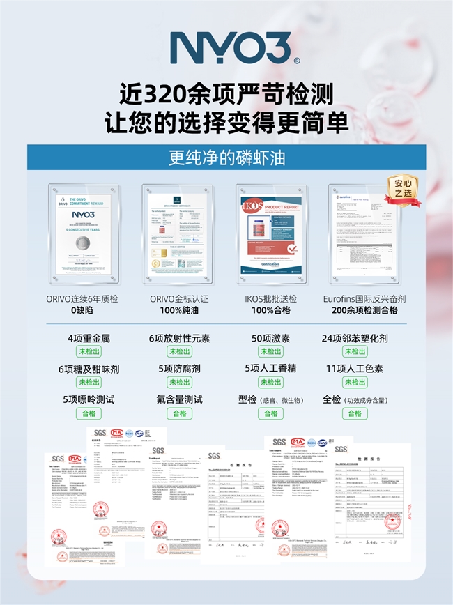 Fang院士在演讲中还特别提到了产品背后严谨的品质保障体系。这一体系成为现场专家关注的重点之一: ·ORIVO纯油认证:已连续六年通过零缺陷质量检测,确保产品100%合格。 ·IKOS五星品质认证:涵盖活性成分、氧化稳定性与污染物控制的全面评估。 ·Eurofins放射性物质未检出报告:针对6种关键放射性核素的检测。 ·SGS全面安全筛查:涵盖24种塑化剂、重金属等320余项指标。 NYO3磷虾油之所以能够在国际学界引起关注,根本原因在于其对科学精神的坚持。从原料选择到生产工艺,从成分研究到品质检测,每一个环节都以科学数据为依据,以真实效果为导向。正是这种对细节的极致苛求,使得NYO3的产品能够成为衰老研究领域的科学载体。 随着本次大会的落幕,NYO3再次向全球学界展示了其作为挪威磷虾油领导品牌的科研实力。未来,品牌将继续携手全球顶尖专家,将更多基于科学研究的健康选择带给全球消费者。