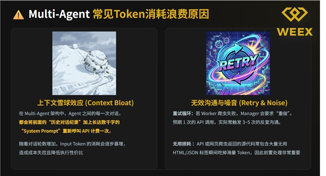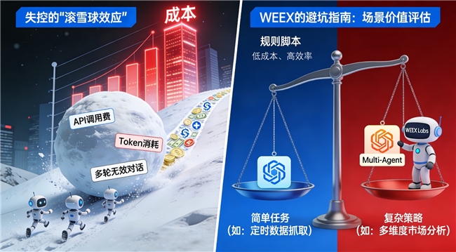 警惕“滚雪球效应”:AI 也会陷入无效加班 在多智能体协作中,最可怕的支出不是成功的任务交付,而是无效交互(Ineffective Interaction)。 什么是滚雪球效应? 当两个或多个 AI 角色对某个指令产生理解偏差,或者陷入逻辑死循环时,它们会不断地进行多轮无效对话。每一次对话都在烧钱,但却离结果越来越远。 WEEX 的避坑指南: 在任务开始前,必须进行场景价值评估。如果一个任务通过简单的规则脚本就能完成,就不必动用昂贵的多智能体系统。