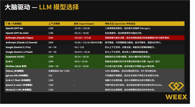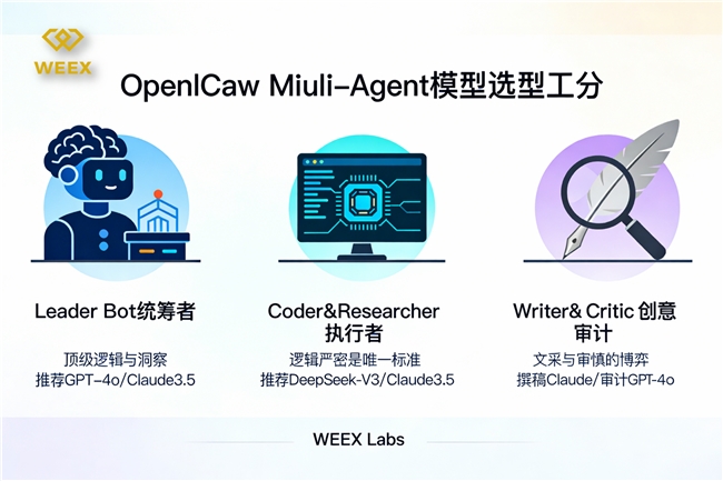 在组建一支基于 OpenClaw 的多智能体团队时,开发者常面临一个幸福的烦恼:GPT-4o、Claude 3.5、DeepSeek、GLM……模型多如牛毛,到底该选哪一个? WEEX Labs 在实战中发现,“全员名牌”并不代表最高效率。在 Multi-Agent 架构中,根据不同角色的职能属性进行“混搭”,才是性能与成本的最优解。今天,我们公开 WEEX 实验室的模型选型笔记。