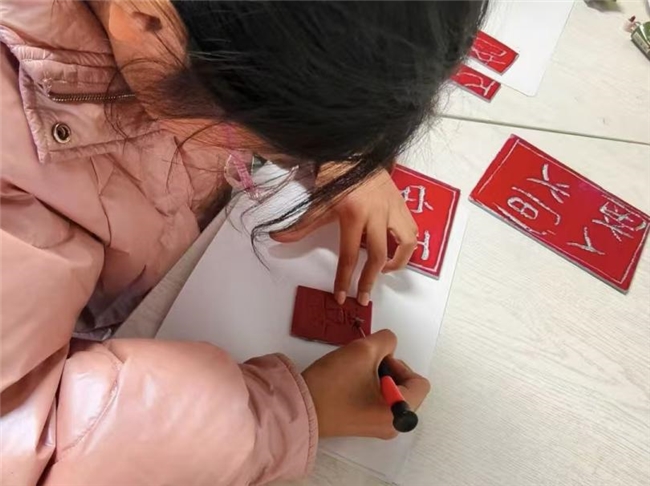 方寸之间篆刻,刀石碰撞初体验 系列活动迎来第三个主题——“篆刻”。老师带领孩子们领略方寸之间的文字之美与刀石之趣。课程从“生活中的印章”引入,迅速激发了孩子们的好奇心。老师简要梳理了篆刻从商周至明清的历史,并介绍了刻刀等工具,结合篆书字体讲解了“运刀如笔”的基本技巧与“疏密有致”的布局美学。随后,活动进入核心的动手实践环节。考虑到安全性与可操作性,科普队特别准备了专用的红色篆刻练习泡沫板。在老师“一对一”的耐心指导下,同学们从最基础的执刀、描红开始,小心翼翼地在泡沫板上练习冲刀、切刀等技法。教室里回响着刻刀与泡沫板摩擦的“沙沙”声,孩子们全神贯注,在方寸之地运刀,亲身感受着篆刻的力道与手感。随着刀刃划过,清晰的凹痕逐渐组成字形,孩子们完成了自己人生中第一件“篆刻”习作,在初次的刀石碰撞中,体验到了传统技艺的沉稳与专注。