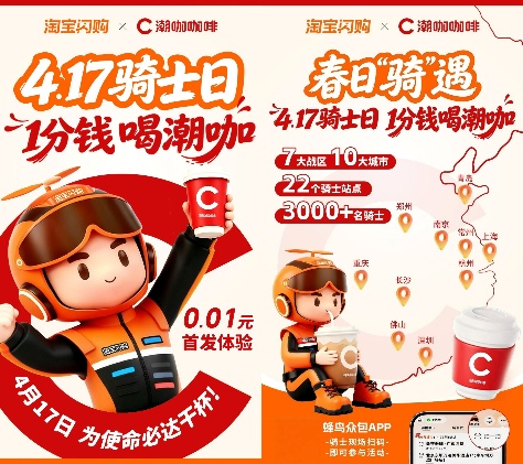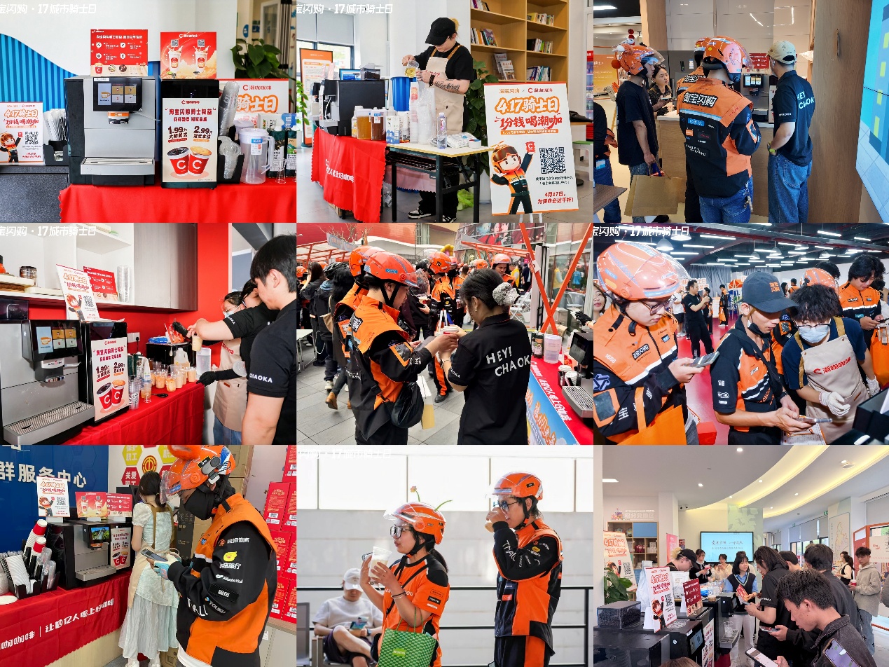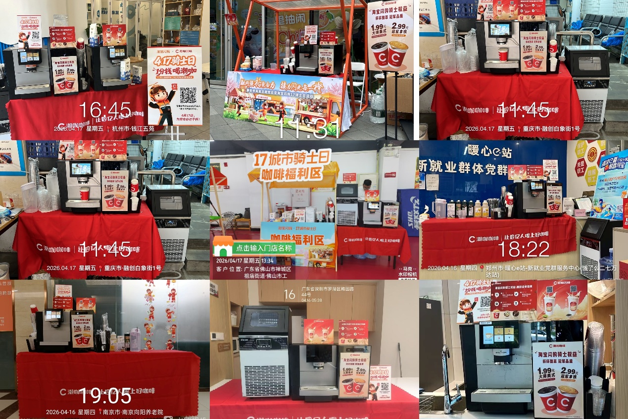 4月17日,潮咖集团联合淘宝闪购在全国7大战区10大城市22个核心骑士站点,落地"417城市骑士日"专属特饮权益服务站。在各驿站活动现场,骑士用蜂鸟APP下单,仅需1分钱,即可享受高品质现磨咖啡及奶茶饮品。即时配送骑手是城市运转不可或缺的力量,潮咖集团与骑士们为使命必达共同举杯,用诚意致敬每一份风雨无阻的坚守。 417潮咖咖啡服务站 首发落地10城22站 “17城市骑士日"是淘宝闪购平台设立的骑手专属节日,每月17日集中开展权益发布、表彰与福利活动,集权益升级、保障落地、荣誉表彰、技能发展于一体,核心理念是让骑士"劳有所得、心有所安、干有奔头”。 潮咖集团联合淘宝闪购,4月17日首发布局并落地7大战区,10大城市,22个核心站点。其中包括上海、杭州、南京、常州、重庆、郑州、佛山、深圳、长沙、青岛等10个城市;场景涵盖:党群服务中心,如:上海静安寺街道党群服务中心、深圳e路同行新就业群体党群服务中心;工人文化宫,如:长沙市第二文化宫、佛山工人文化宫;社区站点,如:市民中心站、常州吾悦广场龙城红色驿站、长沙岳麓区大学城站、青岛万达站等多元场景,区域网共覆盖数千骑士。