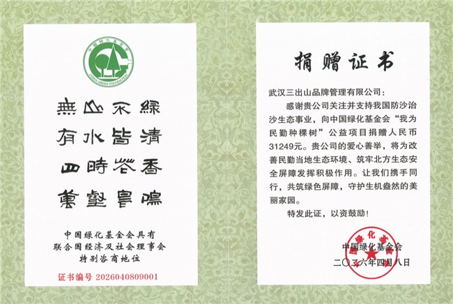 (图为捐赠证书) 从餐桌到荒漠,品牌承诺持续生长 “回馈自然”是三出山自创立以来坚持的品牌价值观。此次民勤公益行,是品牌将这一理念从日常经营延伸至生态保护的实践 —— 通过连接消费者与荒漠化治理现场,让每一份微小的善意产生可量化的生态价值。 三出山相关负责人表示,民勤行动只是起点,未来品牌将持续践行“回馈自然”的承诺,探索消费者可参与的可持续公益模式,让生态保护成为品牌与消费者之间的长期连接。 树会长高,沙漠的春天会来。三出山期待与更多同行者一起,守护自然。
