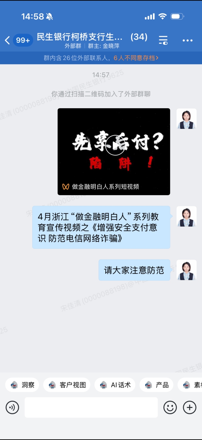 为提升反电信网络诈骗宣传的针对性和有效性,根据 《中国人民银行浙江省分行办公室关于开展金融反诈集中宣传活动的通知》的要求,中国民生银行绍兴柯桥支行于2026年4月开展以“增强安全支付意识、防范电信网络诈骗“为主题的反诈集中宣传月活动。 绍兴柯桥支行高度重视本次宣传活动,支行广泛动员部署,积极调动员工参与,整合内部宣传力量,凝聚共识,上下联动,确保宣传活动有序开展。充分利用网点厅堂公众教育区、电视、展架等统一展示宣传海报、折页,确保信息覆盖广泛、触达精准。 本次宣传活动通过对外拓展业务的方式深入客户群体,更新服务模式。支行于4月走进多家企业,提供上门服务及开展反诈宣传。在活动过程中,通过悬挂宣传横幅,设立宣传摊位摆放宣传折页,结合当前电信网络诈骗高发类型、新型作案手段,精准开展宣传教育工作。重点揭示虚假投资、兼职刷单、网络贷款、网络交友、冒充客服、冒充公检法、冒充领导等常见诈骗陷阱,主动配合公安机关开展打击治理、预警劝阻、资金返还等相关工作。重点普及账户依法开立与规范使用、安全支付相关知识和反诈防骗技巧。 企微群同步开展专项宣教活动。为聚焦当前高发的利用客服电话实施电信网络诈骗违法犯罪行为,强化精准宣教,依托自身所属企微群开展“防范利用客服电话实施电信网络诈骗,守护自身财产安全”的线上宣传活动,揭露利用客服电话诈骗的常见套路,普及针对性防范技巧。 本次反诈宣传活动,进一步筑牢金融安全防线,提升社会公众安全支付意识和反诈防骗能力,切实守护社会公众财产安全。未来,中国民生银行绍兴柯桥支行将不断提升宣传的精准度和覆盖面,切实增强社会公众的防范意识和应急处置能力。